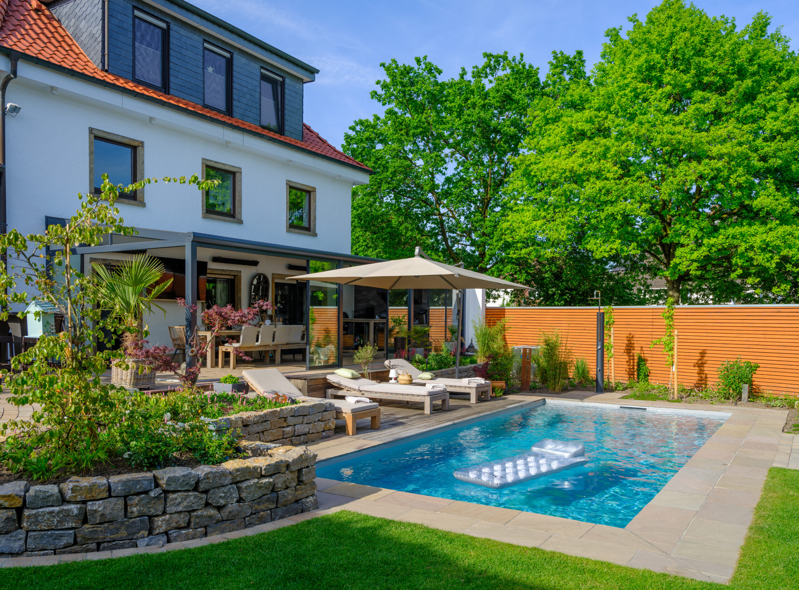 Ein Pool ist eine Investition in Lebensqualität. In Erholung. In gemeinsame Zeit mit Familie und Freunden. Deshalb lohnt es sich, frühzeitig Kontakt zu einem erfahrenen Garten- und Landschaftsbaubetrieb aufzunehmen. Eine professionelle Poolplanung berücksichtigt nicht nur die Wahl zwischen Chlorpool, Salzwasserpool oder Naturpool, sondern auch die Gestaltung Ihres Gartens, die passende Technik, das Design, Ihr Budget und den späteren Pflegeaufwand. Besonders wichtig ist uns, Ihren Pool harmonisch und stilvoll in das Gesamtbild Ihres Gartens zu integrieren – für ein stimmiges Full-Service-Konzept, das langfristig überzeugt.